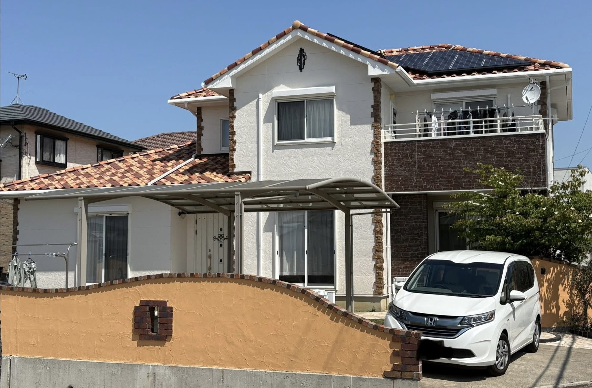 ■外壁・・・日本建設技師協会 久遠の纏 色:19-85B バルコニー 15-30D 塀・・・大同塗料 スムースプラスター 色:17-70L 【施工箇所】外壁塗装・塀塗装